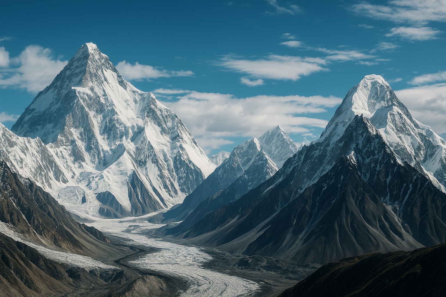 A breathtaking view of towering snow-covered peaks resembling K2 in the Karakoram mountain range. The scene shows sharp icy ridges, glaciers, and dramatic blue skies with soft clouds. The atmosphere should feel grand, inspiring, and adventurous, perfect for an outdoor travel and adventure brand. Cinematic style, ultra-realistic, professional photography look.